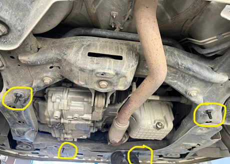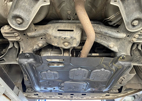 Anschließend wird die Schutzplatte an der Position der Schrauben angebracht. Jede Schraube benötigt zwei Unterlegscheiben. Nach dem Festziehen befindet sich, wie in der Abbildung unten dargestellt, eine separate, abnehmbare kleine Schutzplatte unterhalb der Ölablassschraube.