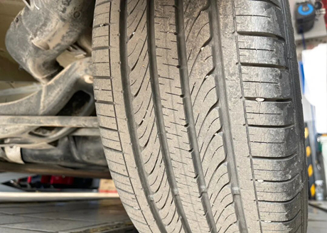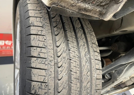 Reifen gehören zu den Gummiprodukten und haben, obwohl sie nur eine begrenzte Laufleistung haben, eine lange Nutzungsdauer, was zu einer deutlichen Alterung des Gummis führt. Der abgebildete Vorderreifen weist zahlreiche Risse im Profil auf, und Gummiblöcke haben sich gelöst. Der Fahrer erklärte dies damit, dass das Vorderrad als Antriebsrad fungiert und die Reibung zwischen Vorderrad und Boden dadurch größer ist, was zu stärkerem Reifenverschleiß führt.