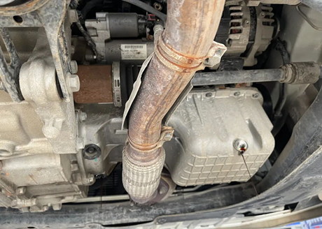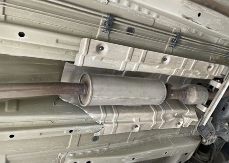 Beim Blick auf den mittleren Teil des Chassis fallen die fehlenden Schutzplatten oder Panzerungen auf, jedoch ist auch kein Rost zu erkennen, was auf einen guten Rostschutz der Envision-Karosserie hindeutet. Am unteren Ende des mittleren Auspuffrohrs befinden sich Kratzer, und oben fehlt ein Stück der Isolierplatte. Laut Aussage des Technikers entstand dies durch Kratzer am Boden; glücklicherweise sind die übrigen Teile in Ordnung.