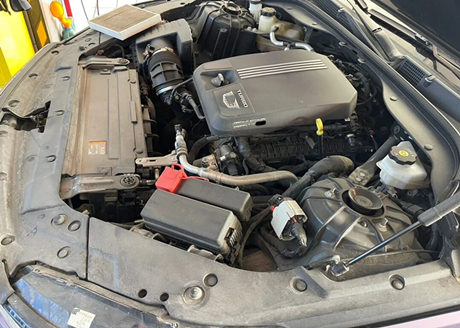 Beim Öffnen des Motorraums sieht man, dass der Innenraum insgesamt relativ sauber ist und nur eine Staubschicht herumfliegt. Der Motor ist längs eingebaut und hat Hinterradantrieb. Motormodell LSY: 2,0-Liter-Turbomotor.