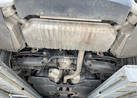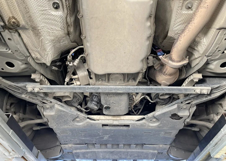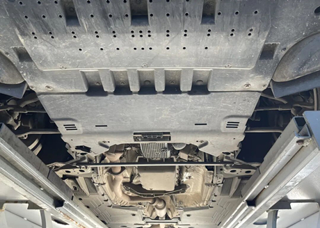 Heben Sie das Auto an und überprüfen Sie den Zustand des Fahrgestells. An der Unterseite des Motors befindet sich eine Kunststoffschutzplatte, die jedoch nur die vordere Hälfte schützt. An der mittleren Karosserie befinden sich auf beiden Seiten Schutzplatten.