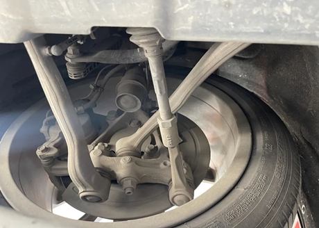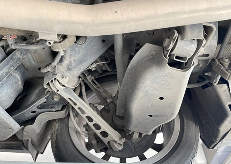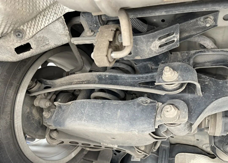 Die Schrauben, mit denen der untere Querlenker und die obere Pleuelstange am Hilfsrahmen befestigt sind, sind Exzenterschrauben, mit denen die Spur der Vorderachse und die Neigung der Hinterachse nach außen eingestellt werden können. Nach der Inspektion sind alle Komponenten der Aufhängung in gutem Zustand.