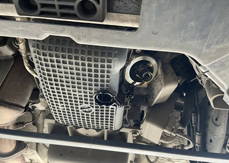 Überprüfen Sie die Komponenten der Vorderradaufhängung, insbesondere die Gummimanschette und das Kugelgelenk. Es gibt keine Probleme. Die Ölwanne des Motors besteht aus Kunststoff. Obwohl unten keine Schutzplatte vorhanden ist, dient ein verstärkter Querträger zum Schutz. Die Ölwanne ist zwischen Hilfsrahmen und Querträger verborgen, um besseren Schutz und ein einfaches Ablassen des Öls zu gewährleisten. Das Ölfilterelement befindet sich daneben und lässt sich leicht austauschen.