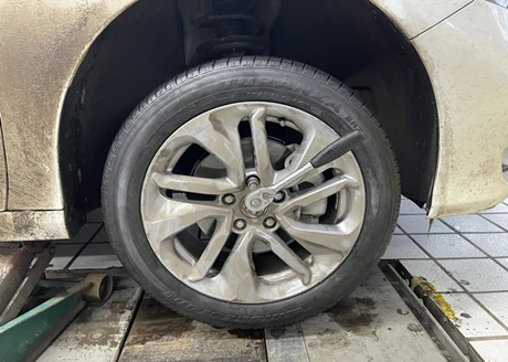 Der Meister zog den Wagenheber und stützte das rechte Vorderrad ab. Wie auf dem Bild unten zu sehen, wurden die Reifenschrauben gelöst und der Reifen vom Boden abgehoben.