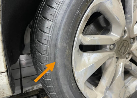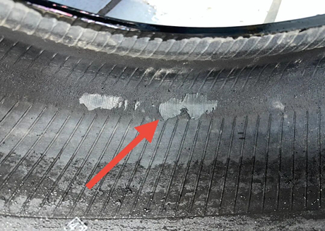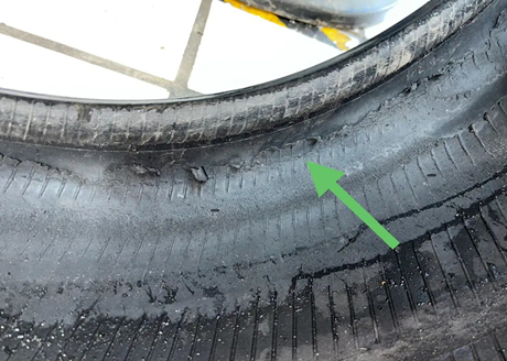 Beim Lösen der Reifenschrauben stellte der Meister eine deutliche Quetschung an der Reifenflanke fest und fragte den Besitzer: „Sind Sie eine gewisse Strecke mit plattem Reifen gefahren?“ Anhand des Pfeils ist zu erkennen, dass die Reifenflanke bereits eine Delle aufweist, die durch das Fahren mit völlig plattem Reifen entstanden ist.