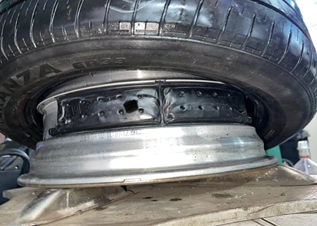 Der Meister sagte, dies sei das typische Verhalten beim Fahren mit völlig platten Reifen. Wenn man weiterfährt, verbleiben viele schwarze Gummireste im Reifen. Bei weiterer Fahrt wird die Reifenflanke zerdrückt und von der Lauffläche getrennt, sodass die Felge direkten Bodenkontakt hat. Dies führt nicht nur zum Reifen-, sondern auch zum Felgenwechsel, was in schweren Fällen zu Schäden an der Radaufhängung führen kann.