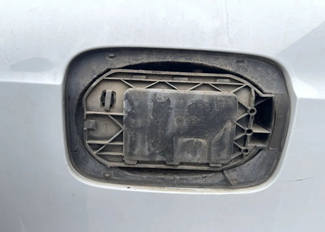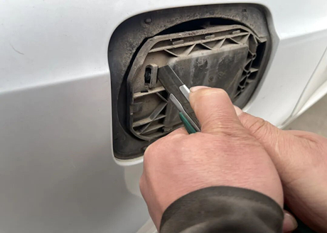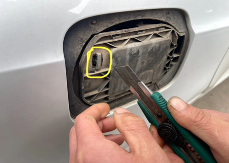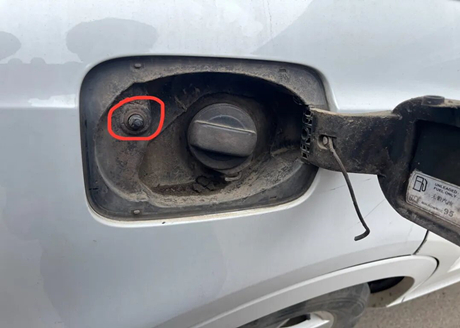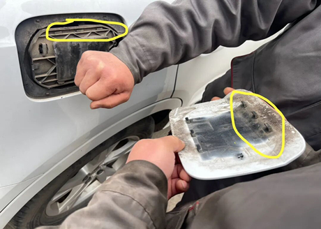 Der Mechaniker versuchte es mehrmals, konnte den Tankdeckel jedoch nicht auf herkömmliche Weise öffnen, und auch der Notentriegelungsschalter im Kofferraum funktionierte nicht. Er musste daher unkonventionelle Methoden anwenden, um die äußere Abdeckung des Tankdeckels zu entfernen, wie im folgenden Bild dargestellt.