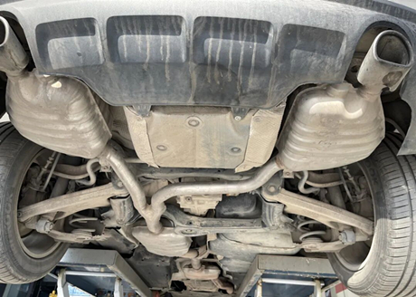Das abgebildete Hinterachsdifferenzial verfügt über einen separaten Eisenblock, der Resonanzen dämpft und am hinteren Hilfsrahmen befestigt ist. Am unteren Ende des Hilfsrahmens befindet sich eine kleine Kunststoffschutzplatte, die das Geräusch von aufspritzenden Steinen reduziert.