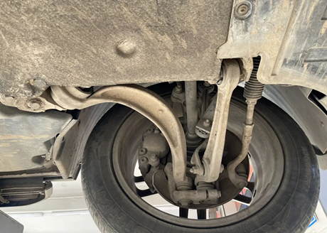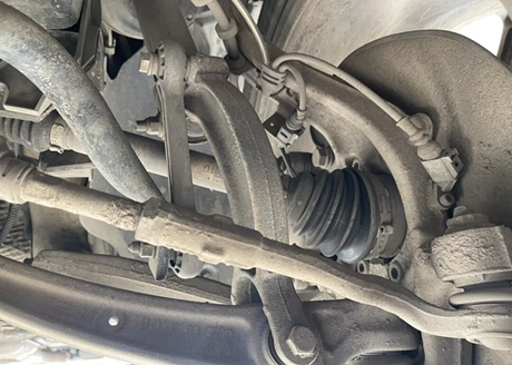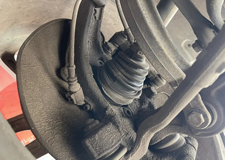 Wir stellten ein Problem mit der rechten Vorderradaufhängung fest. Der Achsschenkel aus Aluminiumlegierung war mit einer Schicht schwarzen Fetts bedeckt. Die äußere Kugelgelenkabdeckung war locker. Der Techniker erkundigte sich und erfuhr, dass die Abdeckung bereits zuvor ausgetauscht worden war. Die alte Kugelgelenkabdeckung hatte Öl verloren.
