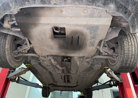 Die Ölflecken auf der Schutzplatte stammen vom Getriebe, wie in der Abbildung unten dargestellt. Am Getriebeboden befindet sich viel Ölschlamm, der an der Öldichtung an der Halbwelle austritt.