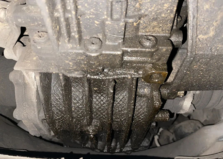Nach der Überprüfung des Fahrgestells suchte der Techniker weiter nach der Ursache der ungewöhnlichen Getriebegeräusche (siehe Abbildung). Die untere Abdeckung wurde entfernt, und es zeigte sich, dass das Getriebe stark mit Ölschlamm bedeckt war. Der Mechaniker bat einen Kollegen, den Motor zu starten und die Gänge im Fahrzeug durchzuschalten. Dies bestätigte, dass das Problem im Getriebe selbst lag, vermutlich durch ein defektes Teil, das sich im Zahnrad verklemmt hatte.