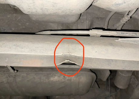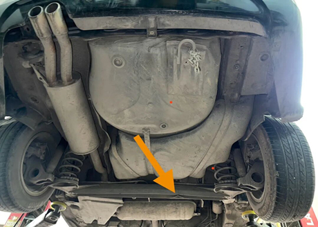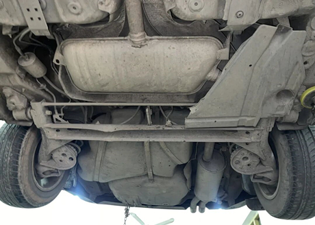 Die Hinterradaufhängung ist eine Verbundlenkerachse, und der Kraftstofftank ist hinten an der Aufhängung angebracht. Heutzutage ist diese Anordnung des Kraftstofftanks bei wenigen Fahrzeugen üblich. Bei einem Heckaufprall kann der Tank leicht eingedrückt werden. Wie der Pfeil in der Abbildung unten zeigt, weist die Hinterradaufhängung bereits Verformungen auf.