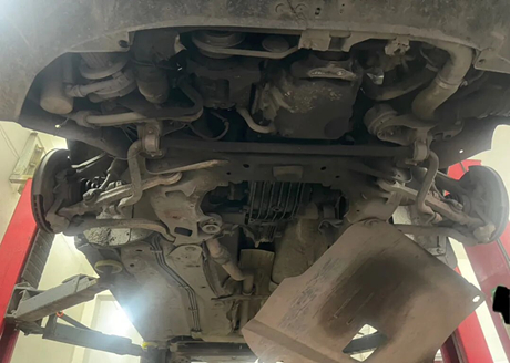 Zuerst vermutete der Mechaniker ein Problem mit dem Kugelkäfig in der Antriebswelle, doch nach einer Überprüfung stellte sich heraus, dass dies nicht der Fall war und es sich wahrscheinlich um ein Problem mit dem Getriebe selbst handelte. Daraufhin hob der Mechaniker den Passat an, um sich zunächst das Chassis anzusehen.